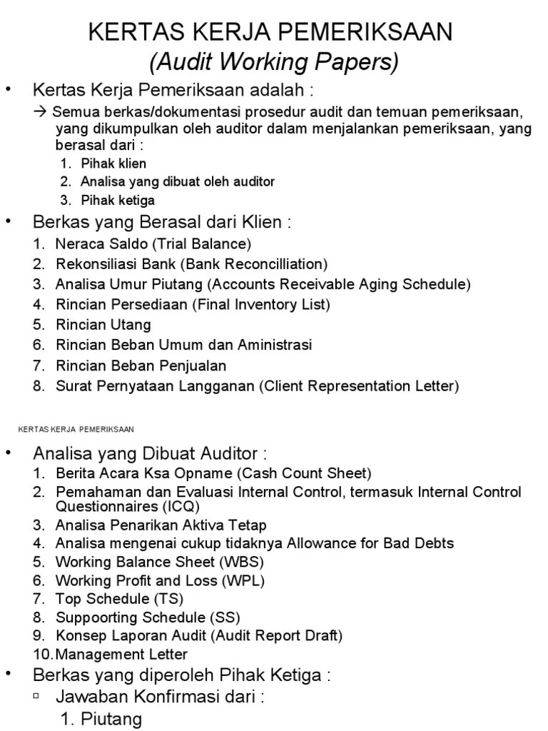 So, what exactly *are* audit working papers (or "kertas kerja pemeriksaan" in Indonesian)? They are the records of the procedures performed, the evidence obtained, and the conclusions reached during an audit. Think of them as the auditor's diary, meticulously documenting every step of their journey through a company's financial records. They're not just for the auditor's personal use; they serve as a crucial communication tool between the audit team, regulators, and even future auditors.